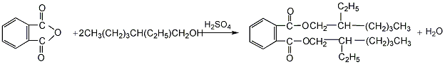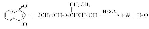 3、间歇法 常压下进行酯化反应,反应产物经中和、水洗、减压蒸馏,回收醇后脱色、压滤,即得成品。其工艺条件如下:原料配比为苯酐∶辛醇=1∶2(质量),催化剂量为总物料量的0.25%~0.3%(质量),酯化时加入的活性炭为总物料量的0.1%~0.3%(质量);酯化温度150℃,酯化时间约为3h。粗酯洗涤的热水温度为80~85℃;蒸馏回收辛醇的温度130~140℃,塔内残压不高于93.31kPa;粗酯闪点要达190℃以上。生产优级品,需将脱醇后的粗酯进行蒸馏,而后压滤。酯化反应式如
