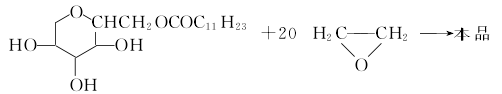 1、将1 mol斯盘20投入反应釜中,在搅拌下加50%液碱作催化剂,逐渐升温,减压脱水,把水脱尽后用氮气置换釜中的空气,驱净空气后升温至120℃开始通入20 mol环氧乙烷,反应温度维持在150~170℃,压力0.2~0.3 MPa。通完环氧乙烷后,冷却至80~90℃,将料液打入中和釜用冰醋酸中和,再用双氧水脱色,最后冷却脱色,最后冷却放料,包装即为成品。在甲醇钠(或乙醇钠)的催化下,在130~170℃时,在span-20中通入一定量的环氧乙烷发生加成反应得产品。