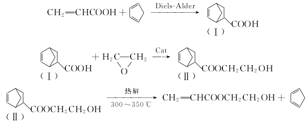 2、直接法 以丙烯酸和环氧乙烷为原料,在催化剂(三氯化钒、乙酸铬或丙烯酸铬)及对羟基苯甲醚阻聚剂存在下,经催化加成反应,最后蒸馏精制制得: