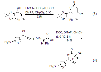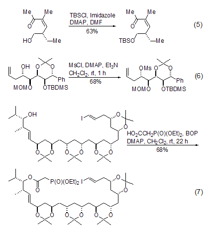在DMAP的催化下,羟基在缩合试剂作用下直接酯化反应的速度和产率均得到显著提高。对于复杂的底物分子,相应地也提高了反应的选择性。文献报道的天然产物全合成路线中,四次用到了该反应 (式3,式4)[5,6]。